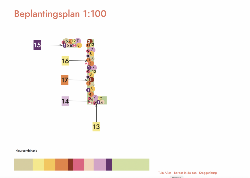 Een vrij smalle border, waar de bewoonster graag meer variatie wilde. De border is heel zonnig, dus heb ik soorten gekozen die daar tegen kunnen. De warmere kleuren passen mooi bij de kleur steen van het pand. Door ook her en der accenten te plaatsen van paars, lila, zalm en donkerrood krijg je een levendig en vrolijk geheel dat nergens saai wordt! Een mooie grassoort zorgt voor een zomerse touch en voor beweging in de border. Reactie van de klant: “Ik heb contact met Joke opgenomen omdat ik graag een bloeiende variërende border wil en dat heeft Joke voor mij ontworpen in een prachtig tuinplan. Ik kan bijna niet wachten om in het voorjaar de kleurenpracht te zien. De voorpret is er nu al!”